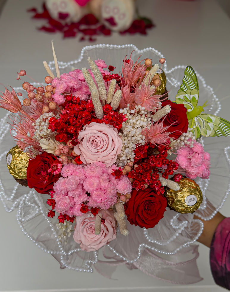 Contents: Preserved red and pink roses, dried floral fillers, Ferrero Rocher chocolates, decorative butterfly.
