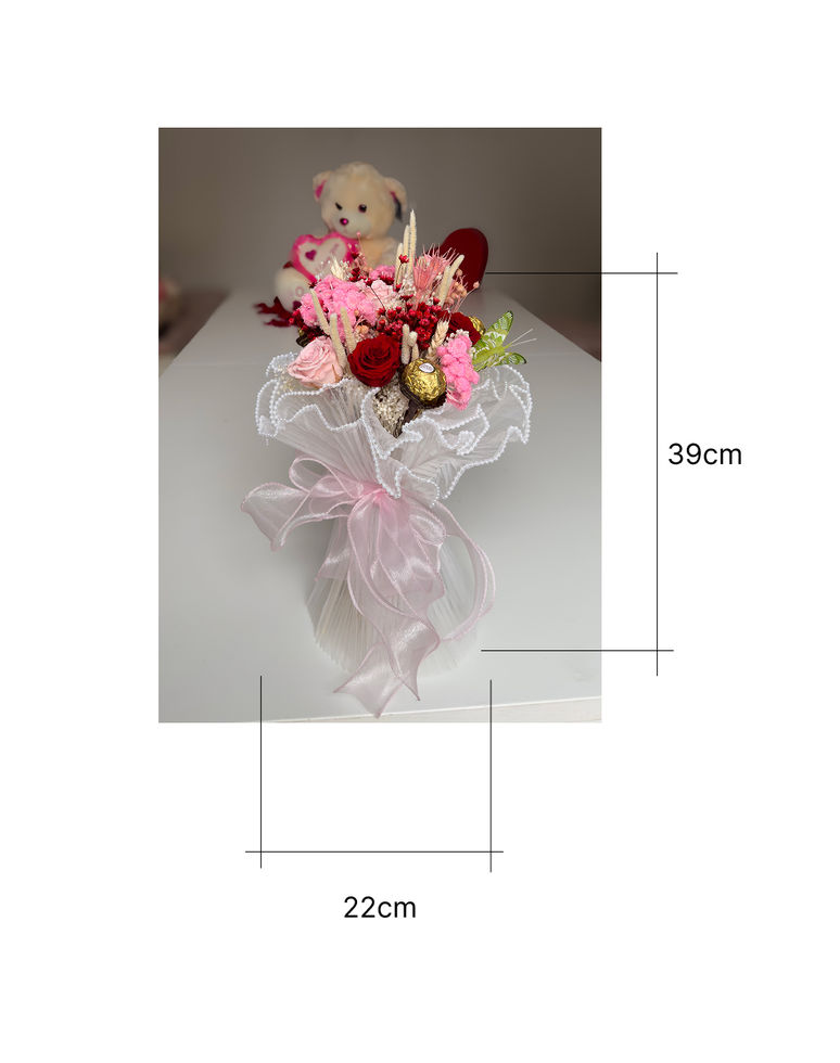 Handcrafted with care, this mini bouquet features a romantic mix of deep crimson and soft blush preserved roses, accented with whimsical dried bunny tails, delicate fillers, and a playful butterfly detail. To make the gesture even sweeter, we’ve tucked decadent Ferrero Rocher chocolates right into the arrangement.